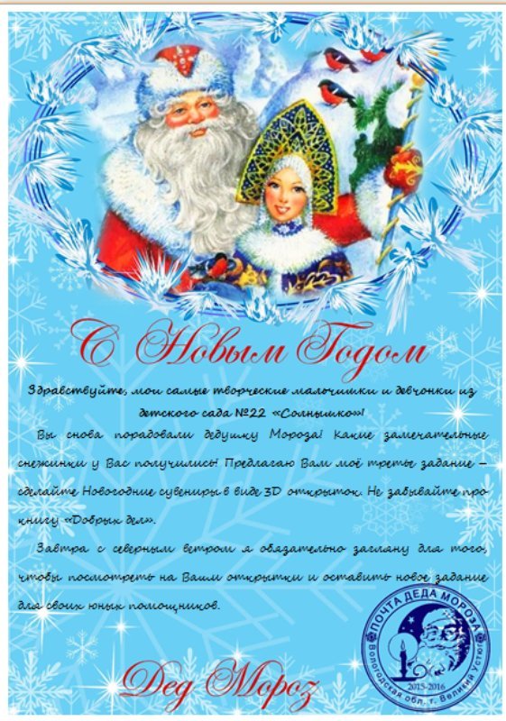 «Снега много не бывает» - именно так называлось второе задание от дедушки Мороза, которое воспитанники детского сада №22 «Солнышко» выполняли в течение всего дня не только в детском саду, но и дома. Снежинки получились по – настоящему необычно – волшебными. И чудо случилось, как только дедушка Мороз убедился, что задание выполнено, на улице пошёл снег, а ребята получили новое задание. Верим в чудеса и продолжаем участвовать в Новогоднем – адвент календаре….