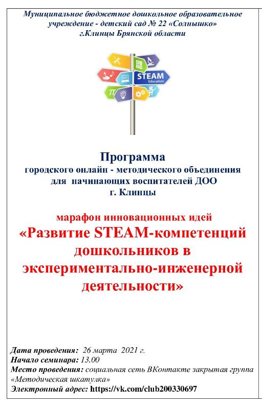 26.03.2021 года на базе МБДОУ – детский сад №22 "Солнышко" в онлайн – режиме состоялось методическое объединение для начинающих воспитателей "Методическая шкатулка". Всех участников МО ожидал марафон инновационных идей "Развитие STEAM – компетенций дошкольников в экспериментально – инженерной деятельности".