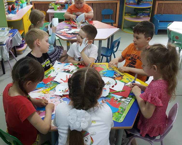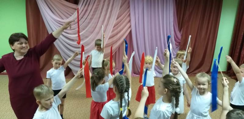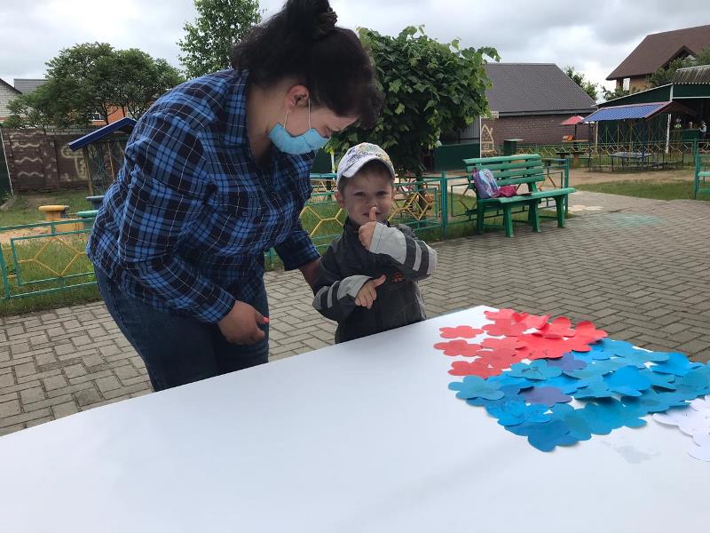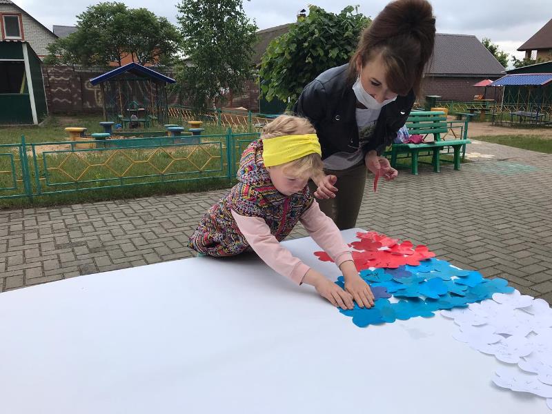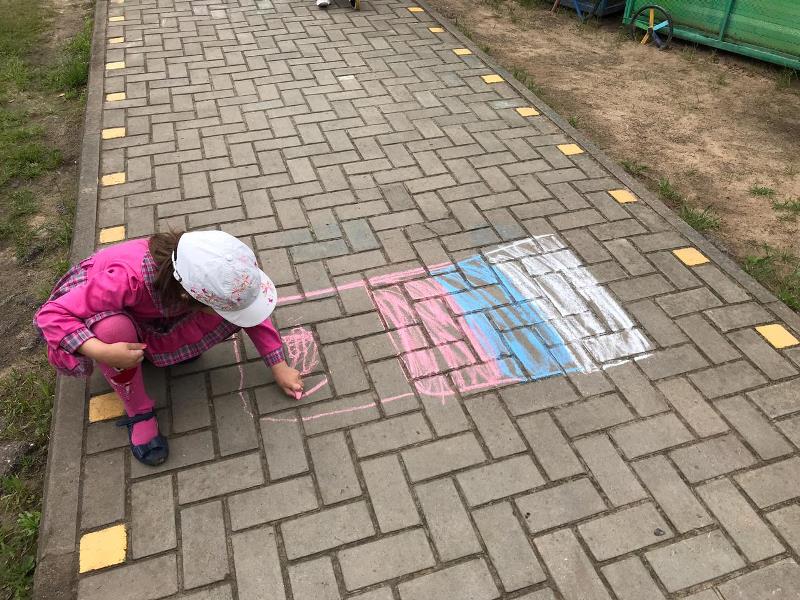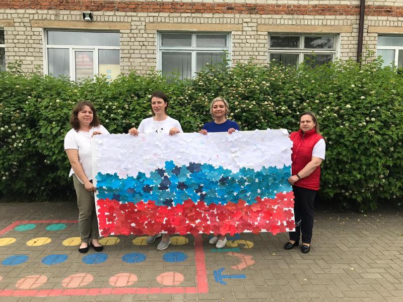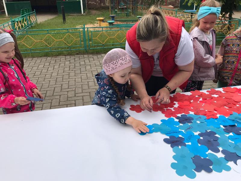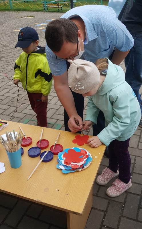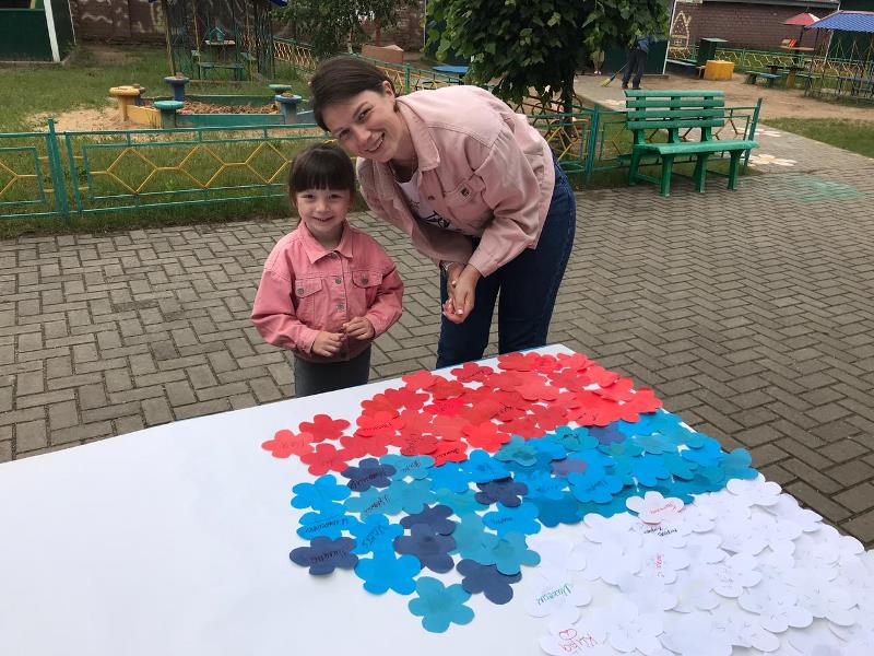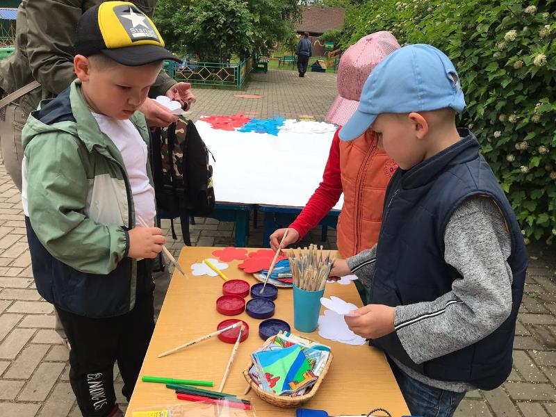 С самого утра на территории детского сада начался творческий марафон "Ты, я, он, она – вместе дружная страна", в котором приняли активное участие дети, родители и педагоги всех возрастных групп. На бумажном полотне постепенно появлялись именные белые, синие и красные цветы, когда всё полотно заполнилось, получился Российский триколор, символ силы и мужества нашей страны. Подхватив патриотический настрой, марафон переместился в группы к ребятам, и творческие мастерские "закипели". Цвет Российского триколора отражался в каждой работе, будь то детская ладошка или сердце выполненные из бумаги. В мастерской средней группы "выросла" настоящая, любимая русскому сердцу – берёзовая роща.