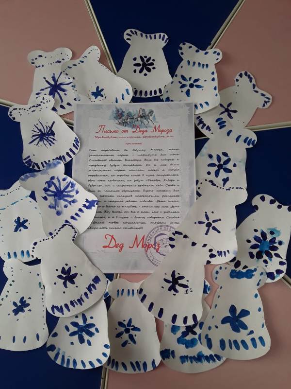 После завтрака в детский сад было доставлено третье – письмо задание от дедушки Мороза, мальчишки и девчонки сразу принялись за его выполнение. Как стало известно из письма, дедушка Мороз отправился в дорогу к ребятам на тройке своих любимых коней: "Декабрь, Январь и Февраль", которые требуют специального ухода и снаряжения. Мороз Иванович попросил малышей нарисовать для своих скакунов уникальные колокольчики в бело – синих тонах, а ребят старшего дошкольного возраста изготовить волшебные подковы, используя его любимые орнаменты Гжель росписи. Юные помощники, проявив свои творческие способности, справились и с этим заданием. Все с нетерпением ждут завтрашнего дня, чтобы получить новое задание от дедушки Мороза.