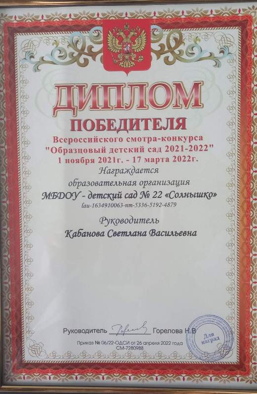 Руководитель детского сада №22 “Солнышко” Кабанова Светлана Васильевна и коллектив образовательной организации награждены дипломом победителя и благодарностью за активное участие и победу во Всероссийском смотре – конкурсе "Образцовый детский сад 2021 – 2022". Воспитатель детского сада №22 "Солнышко", Дубровская Евгения Васильевна, награждена грамотой отдела образования Клинцовской городской администрации. Ещё одним приятным моментом для нас стало чествование молодых специалистов, одной из них стала Понуровская Елена Владимировна. В этом учебном году Елена Владимировна, присоединилась к дружной семье нашего детского сада, в которой начнёт свою профессиональную педагогическую деятельность.