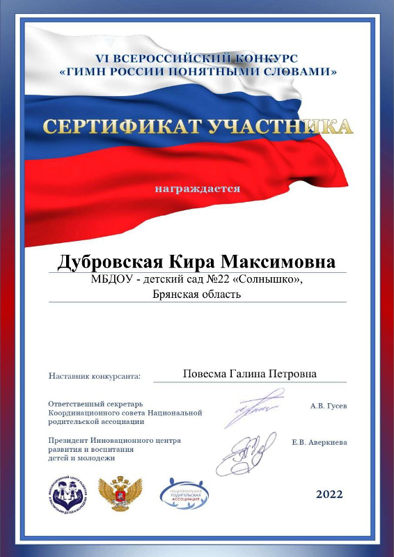 Утро, 25.11.2022 г., в МБДОУ - детский сад № 22 "Солнышко" началось с приятной новости!!! Из Москвы пришли наградные документы VI Всероссийского конкурса "Гимн России понятными словами" воспитаннице старшей группы Дубровской Кире (наставник Повесма Галина Петровна, воспитатель дополнительного образования). ПОЗДРАВЛЯЕМ!!!!!!