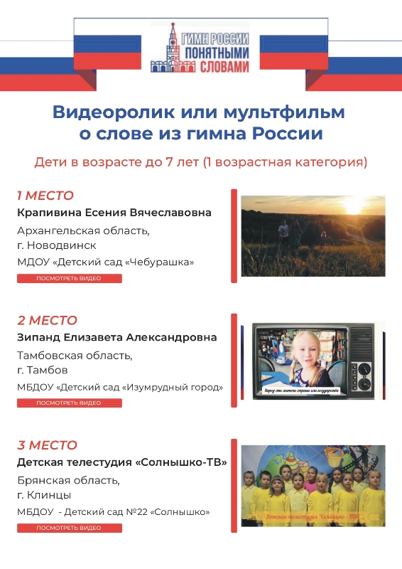 Номинацию №1 «Видеоролик или мультфильм о слове из гимна России» - категория до 7 лет объявляли Киркора Ирина Владимировна - член Почетного жюри конкурса, Заместитель председателя Совета при Президенте Российской Федерации по развитию гражданского общества и правам человека и Бредихин Владислав Игоревич - руководитель Дирекции военно-патриотических проектов Движения Первых!