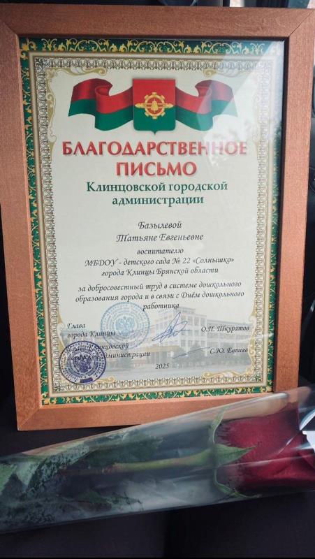- Базылева Татьяна Евгеньевна, вопитатель - награждена Благодарственным письмом Клинцовской городской администрации;