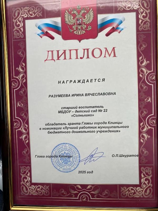 - Разумеева Ирина Вячеславовна, старший воспитатель - обладательница гранта Главы города Клинцы;