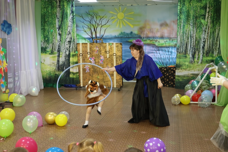 Воздушные шары летали по залу, превращаясь то в собачек, то в змей. Мыльные пузыри кружились в воздухе — дети ловили их, смеялись и пытались удержать эту хрупкую радугу в ладошках!